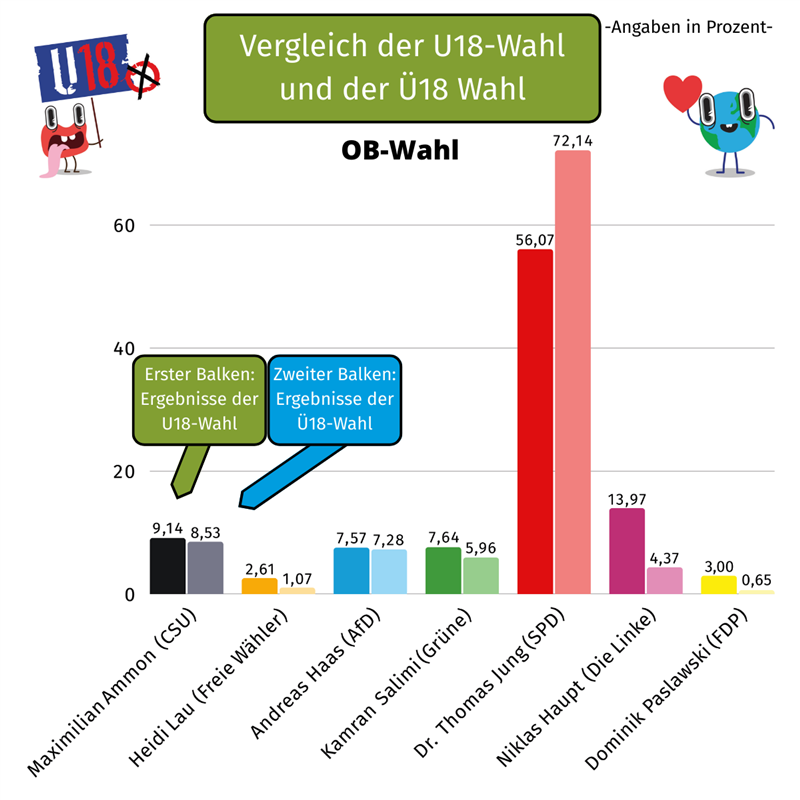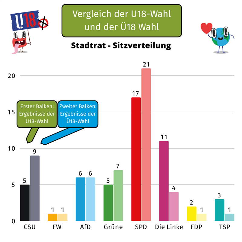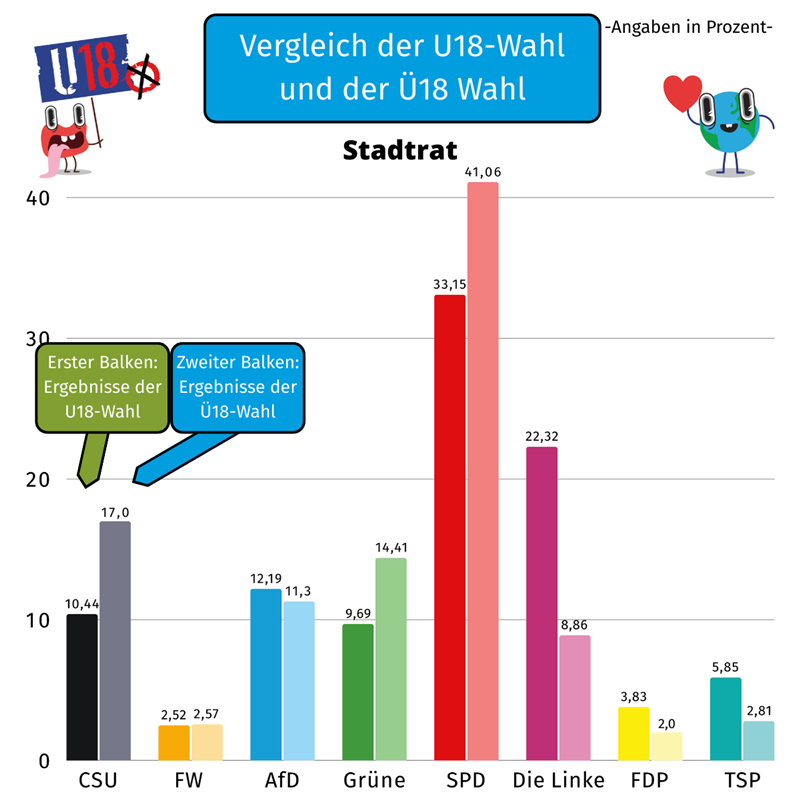 Bei der Stadtratswahl wurde in beiden Fällen die SPD stärkste Kraft. Während sie bei der U18-Wahl 33,15 Prozent erreichte, lag sie bei der tatsächlichen Wahl mit 41,06 Prozent noch deutlich höher. Besonders auffällig ist das Ergebnis der Linken: Sie kam bei den Jugendlichen auf 22,32 Prozent und lag damit deutlich über ihrem Ergebnis bei den Erwachsenen von 8,86 Prozent. Dagegen schnitten CSU und Grüne bei der Ü18-Wahl mit 17,0 beziehungsweise 14,41 Prozent deutlich stärker ab als bei der U18-Wahl mit 10,44 und 9,69 Prozent. Die AfD bewegte sich mit rund zwölf Prozent bei der U18-Wahl und gut elf Prozent bei der Ü18-Wahl auf einem ähnlichen Niveau.