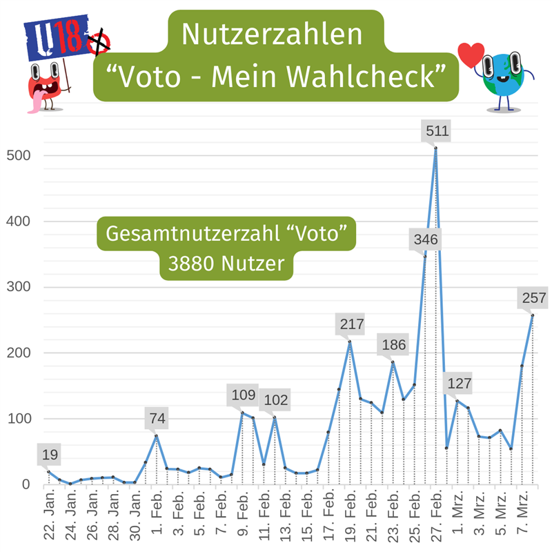Mit Beginn der U18-Wahlphase ab dem 20. Februar, in der Kinder und Jugendliche bereits ihre Stimme abgeben konnten, stieg das Interesse weiter an. Während der anschließenden Wahlwoche bis zum 27. Februar nahmen die Zugriffszahlen deutlich zu und erreichten am Tag der U18-Wahl mit 511 Nutzungen ihren Höchstwert. Insgesamt nutzten 1.690 Interessierte VOTO, um ihre eigenen Positionen mit denen der Parteien abzugleichen.